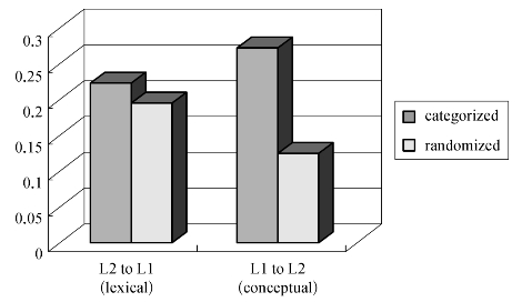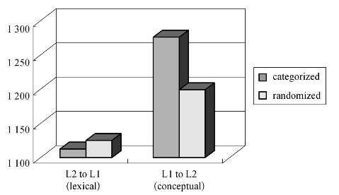 Additional evidence to support the claim that translation from L1 to L2 is conceptually mediated,but that translation from L2 to L1 is not,was provided by the findings for incidental recall that followed the translation tasks in the Kroll and Stewart(1991)study.These data are shown in Figure 7.17 where the mean percent recalled are plotted as a function of the direction of translation and the type of list.The main result was that significantly more words were recalled from the categorized list condition than from the randomized list,but only when the direction of translation was from L1 to L2.Although it might be argued that subjects were more aware of the category structure in the L1 to L2 translation condition because the words appeared in L1 recall for the same L1 words in categorized lists when the task was simple naming was poor,and no better for categorized than randomized lists.The Kroll and Stewart(1991)results thus suggest that the translation route from L1 to L2 specifically engages conceptual information that influences the speed and accuracy of translation performance and also has consequences for later tests of explicit memory.