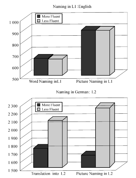 Figure 7.13 Dataaveraged from Kroll and Curley(1988).The time to name words and pictures in English and to translate words from English into German and to name picturesin German for subjects who were more and less fluent in German.