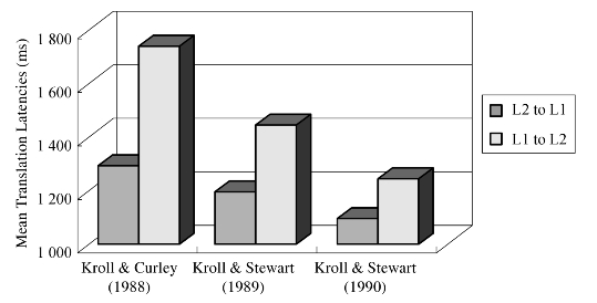 Figure 7.14 Acomparison of the speed of translation from L 2 to L 1 and L 1 to L 2 from three studies.Note:The Kroll and Curley(1988)data above were from that study but did not appear in that paper.