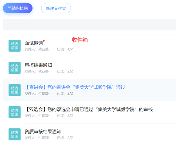 收件箱:在收件箱模块,用人单位可以收到学校的通知,例如用人单位报名参加双选会、宣讲会的审核通知或企业资质申请的通知。