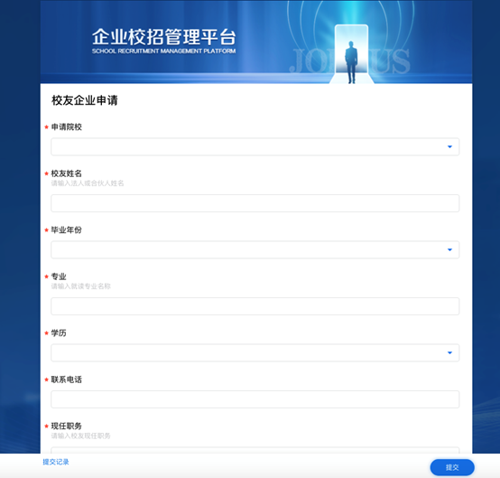 校友企业申请:若是校友企业,可以填写相关信息,学校管理员会进行审核