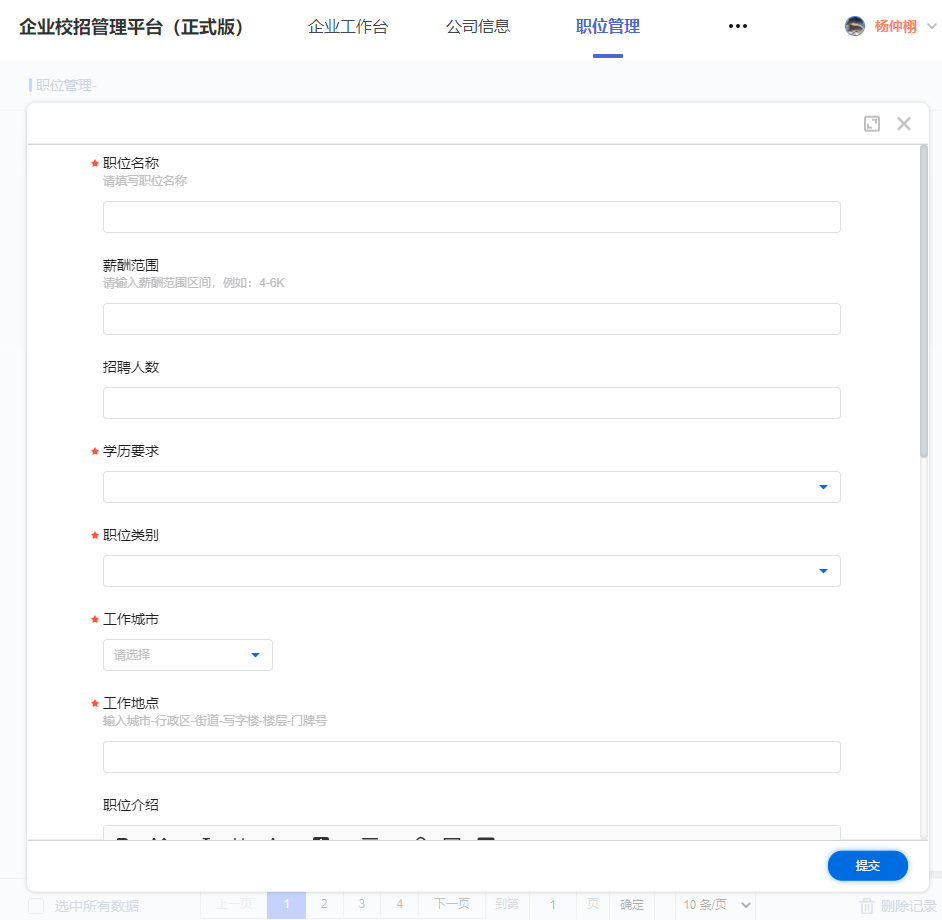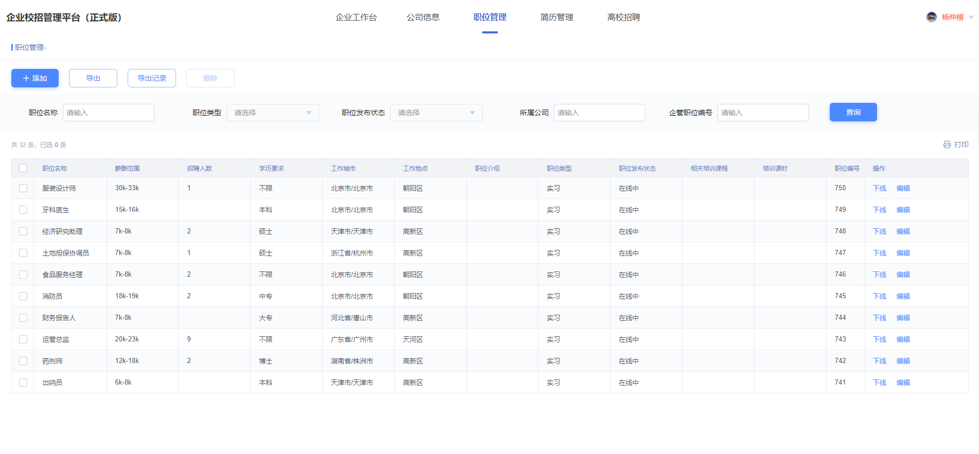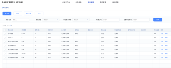 3) 职位管理:用人单位人员可以在招聘平台上添加职位,并且可以对职位进行管理,发布、下线、编辑、删除等等
