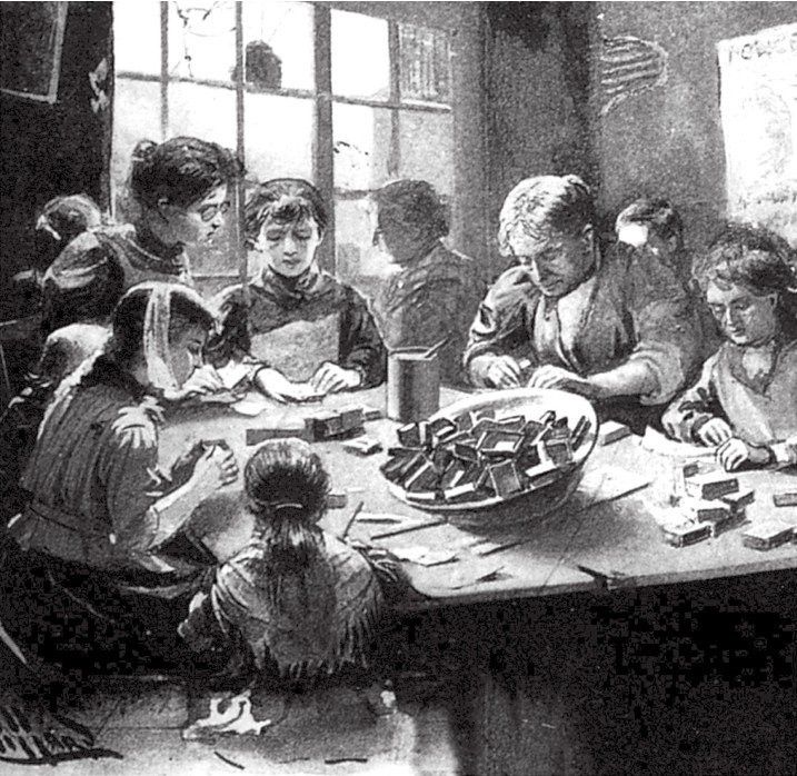 20世纪初,英国经济仍然保持着工业革命开始以来的世界领先地位,但日益严重的社会两极分化问题却未见改善,贫富悬殊持续扩大。当时的社会学家查理·布思就社会现状首创了“贫困线”(Poverty line)一词,称伦敦仍有1/3的人生活在贫困线以下。这使英国不得不面对消费能力衰退使经济发展受阻,进而导致失业率持续上升这样一个恶性循环的威胁。图为伦敦的一个贫困家庭。为了谋生,全家人不得不利用闲暇时间一起制作小商品来贩卖。