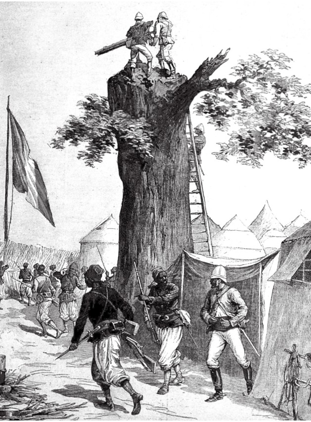 19世纪末,非洲的法属殖民地士兵主要由当地的土著黑人组成,指挥官由欧洲的白人担任。他们是宗主国殖民地政策的最大保障者,为欧洲的商业公司在殖民地攫取资源和财富提供武力支援。图中描绘的是非洲的法属殖民地的边境哨所。