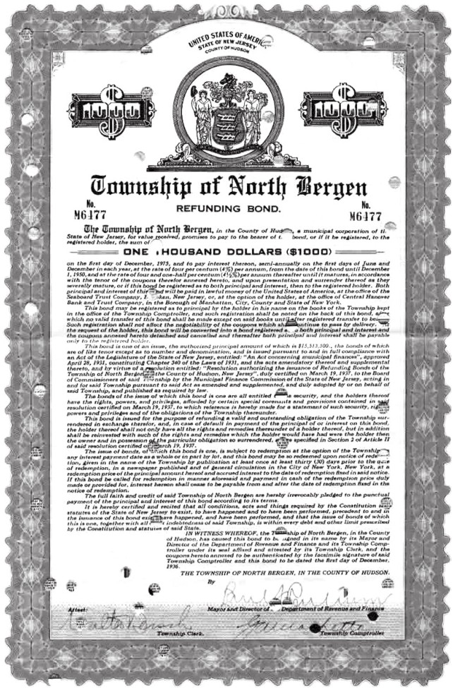 债券作为一种债务凭证,与其他有价证券一样,也是一种虚拟资本,而非真实资本,它是经济运行中实际运用的真实资本的证书。而抵押债券是以企业财产作为担保的债券,抵押债券的价值取决于担保资产的价值,但一般超过它所提供的担保债券价值的25%到35%。图为美国新泽西州北卑尔根海运公司于1936年发行的1 000美元公司抵押债券。