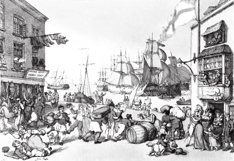 朴茨茅斯位于英格兰南部,于1194年正式建市,它东邻英吉利海峡,与怀特岛相对而望,是英国现在的海军基地。朴茨茅斯在英国虽然并不算大城市,朴茨茅斯港也比不上利物浦港有名,但它却可能是中国人最早知道的英国地名之一。1792年,马戛尔尼访华使团就是从朴茨茅斯港出发,出访乾隆当政的大清帝国。图为1811年的朴茨茅斯港,客商们正忙着将货物搬上货船。