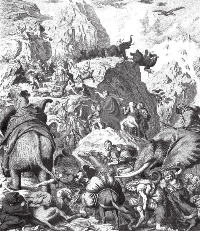 公元前264—前146年发生在古代罗马与迦太基之间的三次战争,因为当时罗马人称迦太基人为“布匿”,故名“布匿战争”。第一、二次布匿战争是作战双方为争夺西部地中海霸权而进行的扩张战争,第三次布匿战争则是罗马以强凌弱的侵略战争,以罗马征服迦太基结束。图中所绘的是公元前218年迦太基的军事首领汉尼拔翻越阿尔卑斯山的情景。