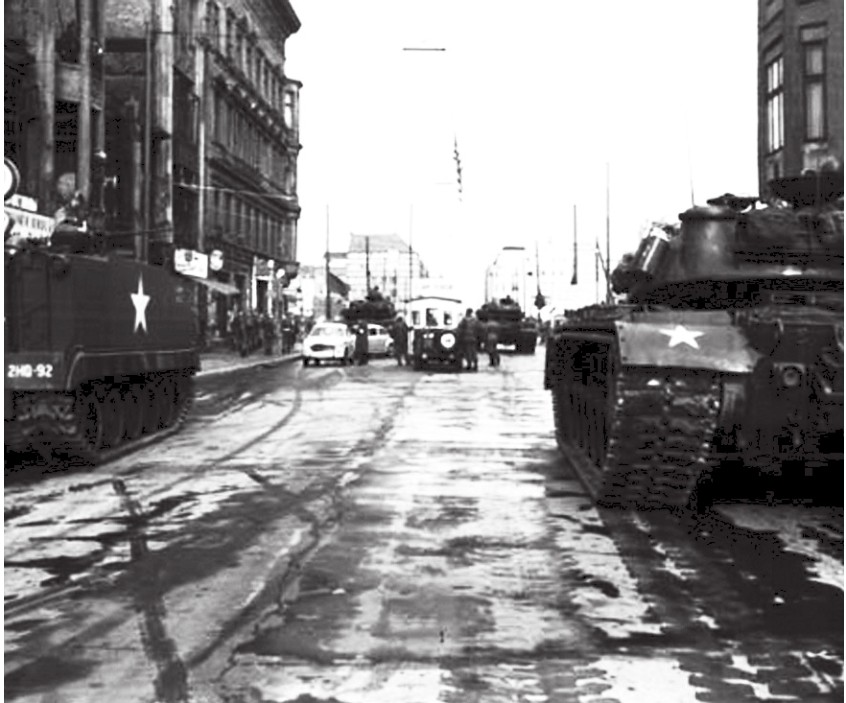 “二战”结束后,世界被划分为以美国和苏联为中心的两大阵营,双方在政治和外交上持续着对抗、冲突和竞争。由于核武器的出现,加之世界大战的阴影还未散去,尽管这一时期的分歧和矛盾日益严重,但双方都还是尽力避免直接冲突,一般通过局部代理人战争、科技和军备竞赛、外交竞争等“冷”方式进行对抗,因此被称为“冷战”。图为1961年美军和苏军在“冷战”的最前线柏林针锋相对而不出手的情景。