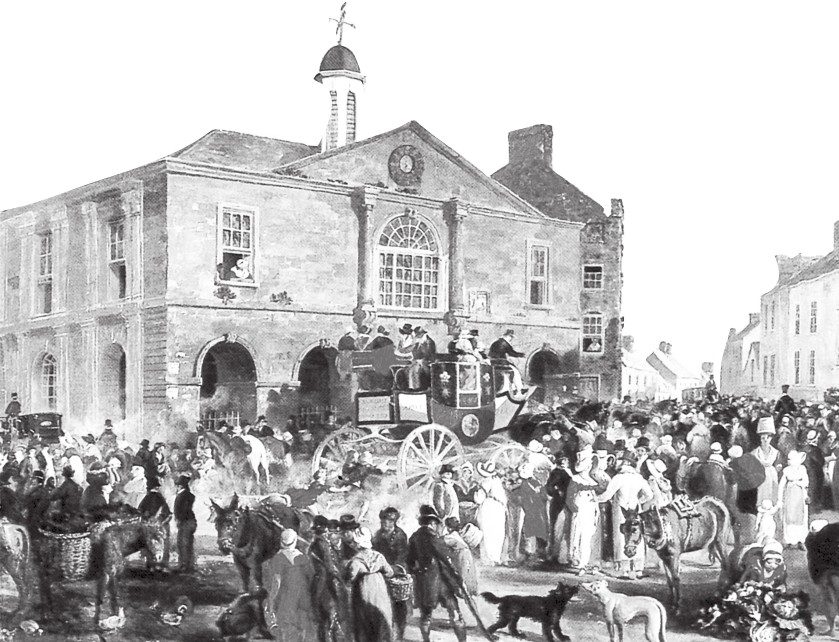 1820年,爱尔兰颁布了限制进口的《谷物法》,农场主们从中受益良多。19世纪20年代,家畜价格的上涨促使地主和大农场主们考虑恢复饲养业,同时,海上出现的快速蒸汽货轮也给了他们信心。图为位于克莱尔郡艾尼斯的热闹市场。