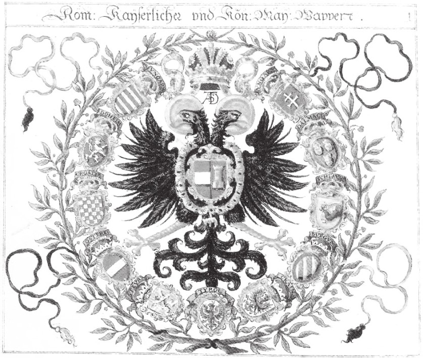 10世纪中期,德意志国王奥托一世在罗马由教皇约翰十二世加冕称帝,成为罗马的监护人和罗马天主教世界的最高统治者。300年后,德意志帝国正式使用“神圣罗马帝国”作为官方名称,一直沿用到1806年被拿破仑终结为止。但实际上早在中世纪末期,帝国内部已经四分五裂,成为由诸多贵族领主统治的公国、侯国的联合;三十年战争后,帝国更是名存实亡。图为神圣罗马帝国的国徽。