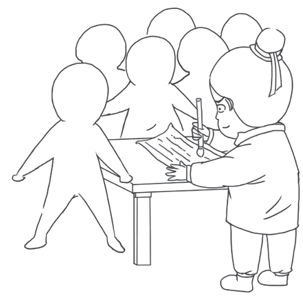 王勃侧身对父亲答道:“放心,我行!”上前接过了笔砚。