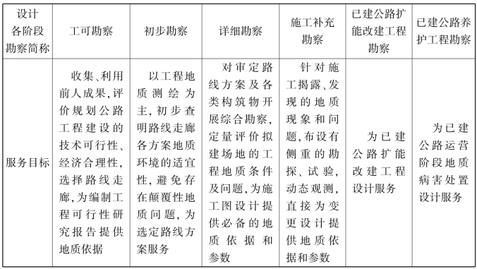 表1.1 山区公路工程设计各阶段工程地质勘察服务目标