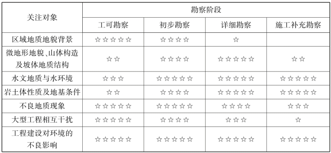表1.2 山区公路工程地质勘察对各阶段评价重点的关注程度
