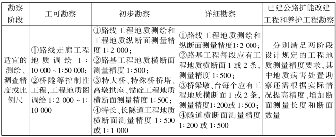 表1.3 山区公路勘察各阶段工程地质调查及测量精度选择表