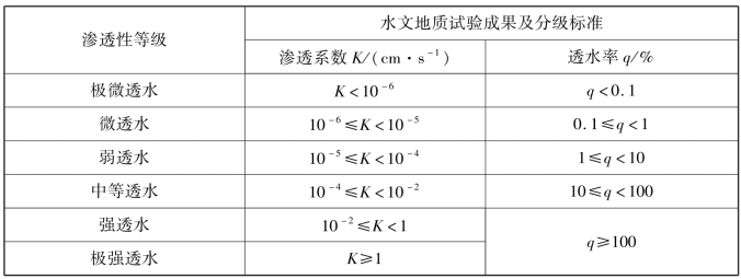 ⑤获取岩土体渗透性指标后,应进行岩土体渗透性分级,以满足水文地质、工程地质条件评价需要,见表1.8。