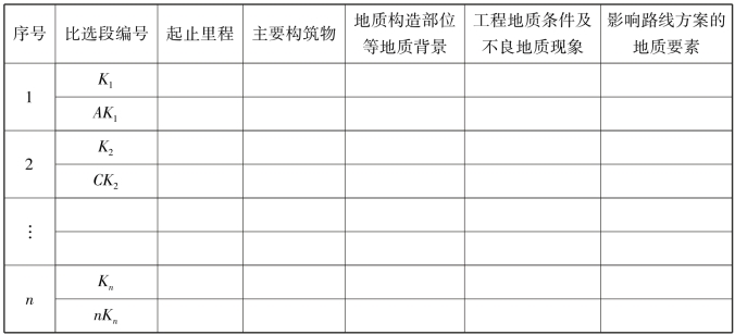 表2.1 路线勘察比选方案工程地质条件比选要素表
