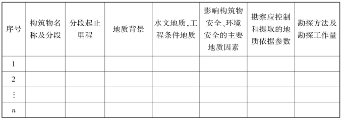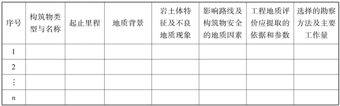 ②详细勘察阶段需要按拟定的路线方案、技术标准、建设原则,全面、系统地进行路线和构筑物拟建场地综合勘察。为落实勘察阶段的各项要求,路线勘察纲要需要用专门章节论述,介绍控制性工程、重大复杂构筑物拟建场地和复杂路段的地质背景、工程地质条件及问题、勘察工作量布置情况等,指导勘察有计划、保质保量地实现施工图设计的目标,见表2.3。