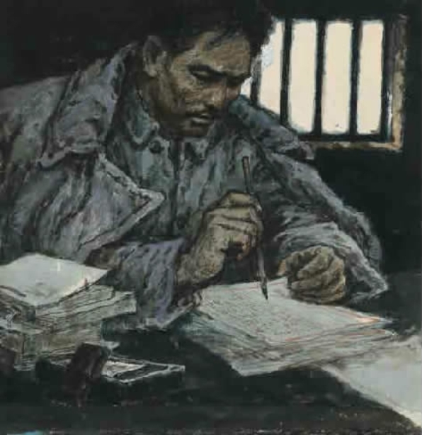 今天在换班的看守兵推开门来望望他——换班交代最重要的一个囚人——的时候,却看到祥松没有看书,也没有踱步,他坐在桌边,用左手撑住头,右手执着笔在纸上边写边想。祥松今天似乎有点什么感触,要把它写出来。他在写些什么呢?啊!他在写着一封给朋友们的信。