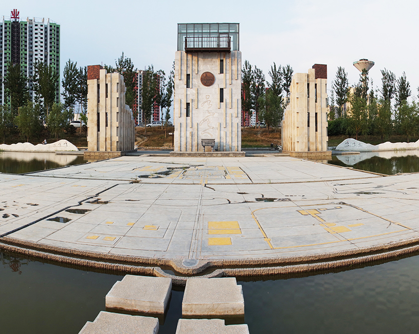 山形大门,如意池环绕的平地上刻画着金元明北京城水系图,整个园门景观也自成一个水系。莲花池水系是北京城最早开发的地面水源,是古代蓟城、唐幽州、辽南京、金中都城池和园囿依仗的重要水源。