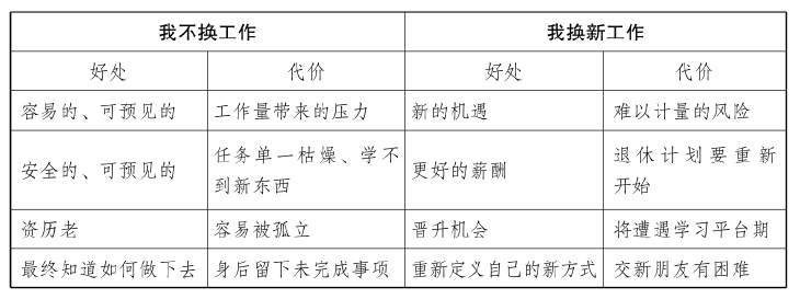 然而,当我们在考虑一段工作或者关系是否该有所改变时,的确可能列出一长串好处与代价的对照清单,在这过程中往往会有更情感化和直觉化的东西卷入其中,例如:“该死的,我不能再这样下去了!睡不着。起不来。想不透。我除了瞎想我的生活是如何被浪费掉的其余什么都没做。我得做点儿什么!”