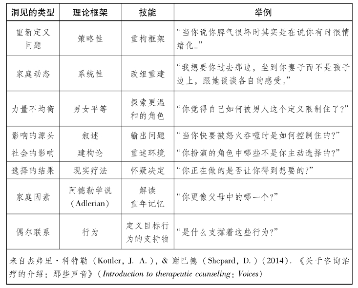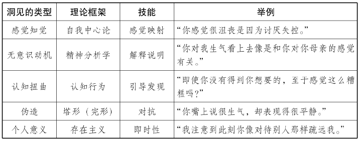 心理学家们正忙着推广洞见这个概念,或者至少有些案例。西格蒙德·弗洛伊德的早期研究表明无意识的欲望一定与现有问题有关;卡尔·罗杰斯(Carl Rogers)认为对于理解不被熟知的感觉很重要;亚伦·贝克(Aaron Beck)和艾伯特·埃利斯(Albert Ellis)的认知行为学认为要辨识和挑战内心的解释,因其会引发情感痛苦。以上这些都说明洞见已然成为疗程中必不可少的部分(见表9.1)。
