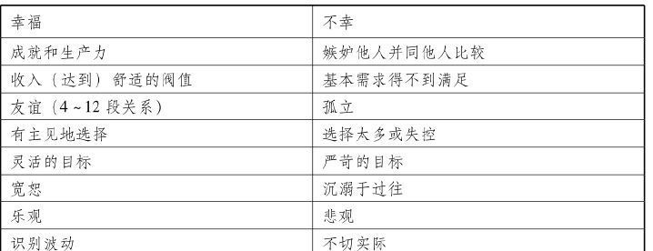 基于100名研究者调查“什么能够带来幸福”的证据显示,有一些出人意料的重要结果(见表11.1)。例如,我们在生活中投入如此多的时间和精力,如果不算沉迷,至少可以说专注于工作上的成就和财富的积累,但是满足某种程度的基本需求后,生活大体安康的人和被视为富有之人并无显著差异。