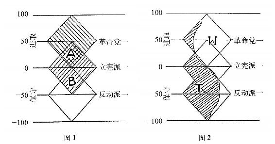 造成激进、温和、保守的因素,除了家庭社会背景之外,教育更有密切关系。清季之世,儒家文化趋向保守,西方文化强势出击。接受西洋文化者进取,固守儒家文化者保守。革命党人多数羡慕西洋文化,力图效法;保守派固守传统,一成不变;立宪派半新半旧,有进取,有保守。再以三个重叠的菱形表示(图2),以S分开传统文化(T区)与西方文化(W区)的影响,可以看出三个党派的新旧教育关系。当然,并非没有例外,在此不必深论。