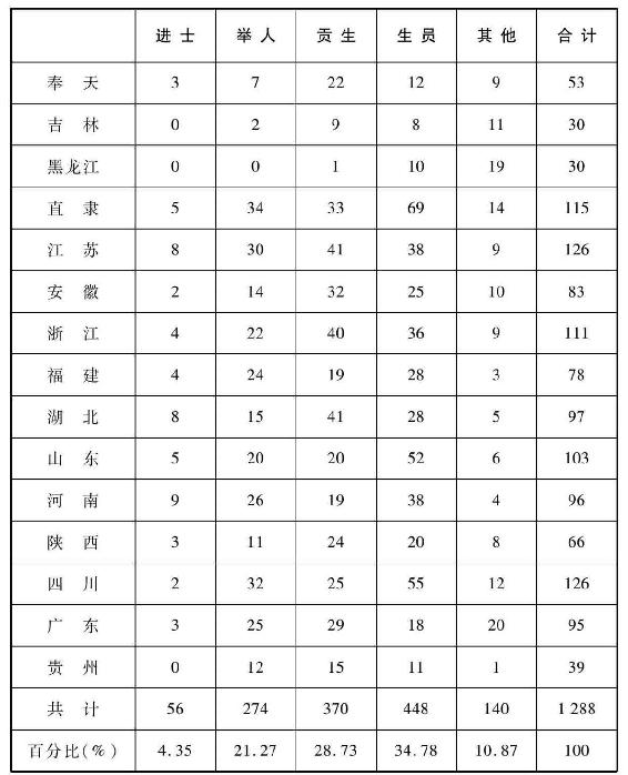 以著者粗浅的了解,其他各省士绅当选的情形,亦大致相同。我们确知此1 643名议员中,总共有84位具有进士功名,[43]其百分比(4.98%)高于奉天等十五省之平均数。革命党人谭人凤对谘议局当选议员的批评说:“他们谘议局的人,不是翰林进士,就是举人秀才,在社会上潜势力非常的大。”[44]日人井一三郎于参观各省谘议局后,谓“议员大多为来自田间的读书人”。[45]其他类似之批评甚多,有相当的正确性。