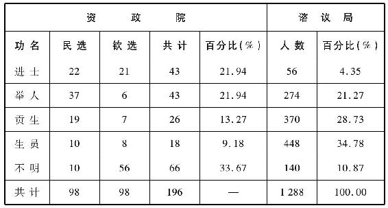 资政院民选、钦选议员的出身背景,仍以具有功名的绅士为多数,尤其是上层绅士的比例高达57.1%,下层绅士尚不足百分之十(9.18%)如以之与谘议局比较,各省谘议局之拥有进士功名者,仅得4.35%,而资政院中高达21.9%(见表4),显得功名越高,越有向中央发展的机会,可见传统的影响力仍然十分强大。