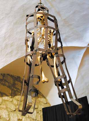 3个不同的铁笼。它们更准确地应被称为“吊笼”,尽管这个称呼多少会与绞刑架相混淆,且早期的断头机有时候也称吊笼。无论装载尸体公开示众,还是把活着的受害者锁在里面让其死于暴晒,这类奇观都助长了这些刑具的使用。