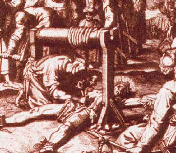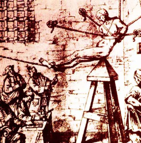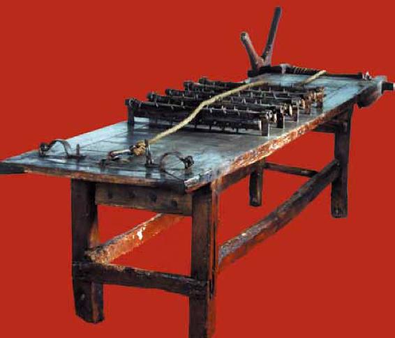 受害者会被用绞盘“拉长”5英寸或12英寸,这一不可思议的长度来源于手臂和腿部所有关节的脱位和拉伸、脊柱的断裂,当然还有四肢、髋部和腹部的肌肉的破裂和分离——不用说,它所造成的后果有多少是致命性的。