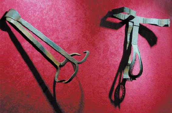 上图左边的那个装置是一个完全不同的酷刑刑具,专为女性生理部位设计。这个刑具应被称作“乳房钳”(Breast Ripper)。它既可以作为惩罚工具,也可作为审讯器械。在用作惩罚之用时,它被烧成赤红,烙在未婚生子的妇女的乳房上。在审讯中,它用来穿透和刺破已定罪妇女的裸露的乳房。