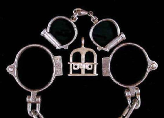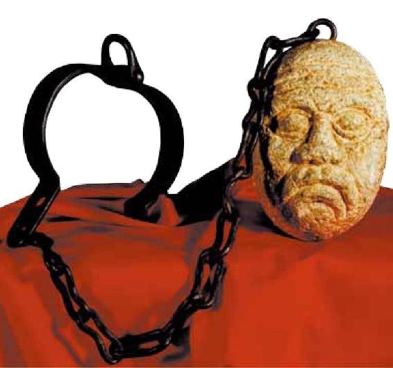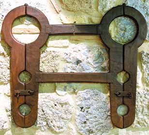 有很多式样的镣铐用来把重物绑在人身上:脚镣、臂铁、腰带以及各种各样的项圈。图中是一个奇特的石球和铁链的组合。被锁进这个铁项圈中的犯人,将被迫长时间携带着这个重物,时间可长达几周、几年甚至整个后半生。这个奇特的石头重达27磅(超过12公斤)。