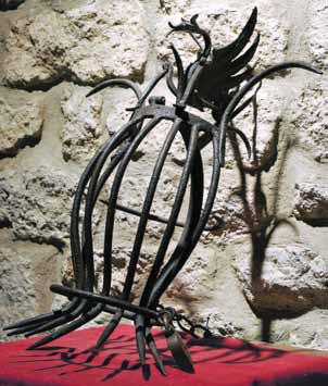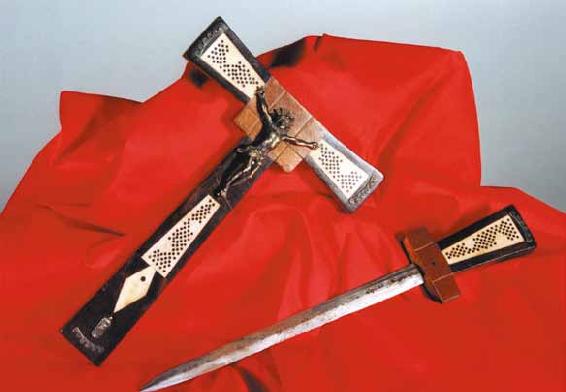 内藏一把短剑的十字架。这个刑具可能是用来救赎和杀死一个异教徒,他或许在宗教审判大会上由宗教裁判所官员公开地处决。如果受刑人宣布放弃“错误的信仰”并拥抱十字架,宗教审判官或许会怜悯他,用短剑痛快地杀死他,而不是让他在烈火中缓慢痛苦地死去。