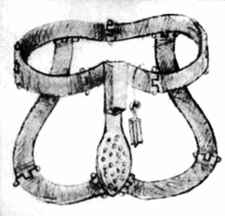 在西方世界中第一次提到贞操带(Chastity Belts),是在康拉德·凯泽尔·冯·埃赫施塔特的《战争防御工事》(Bellifortis,公元1400年左右)中,书的主要内容是关于那个时代的军事技术。书中有一幅图(见页末),还附有一句拉丁文:“佛罗伦萨的妇女们就像这样被禁锢在一条沉重的铁带里。”