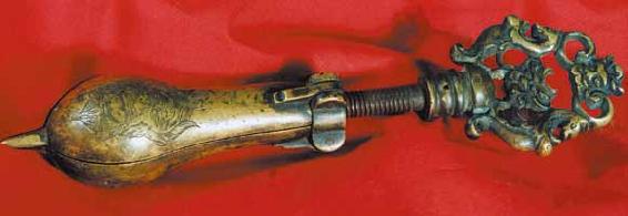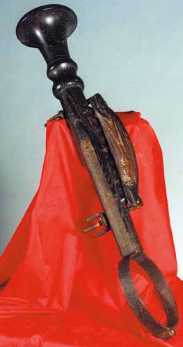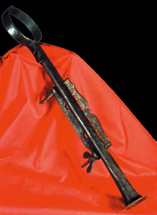 这个刑具被称为聒噪者的横笛或长笛。很多这种形式的乐器(木制的、铜制的或者铁制的喇叭、长号、双簧管、竖笛)在16~17世纪广泛存在——尽管在更早或者以后的时间里也发现了这种刑具。铁项圈锁在受害者的脖子上,而受害人的手指,如同那些演奏音乐的人那样被卡在长钳的槽口里,并用力挤压,力道小则令人不适,大则让人难以忍受。