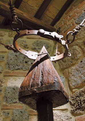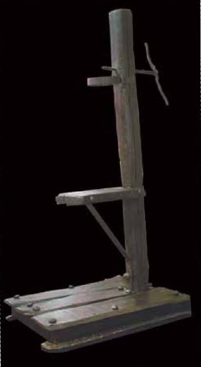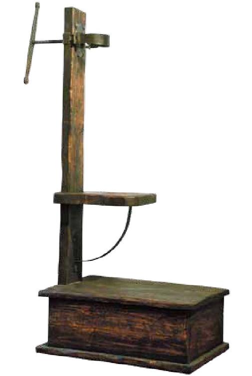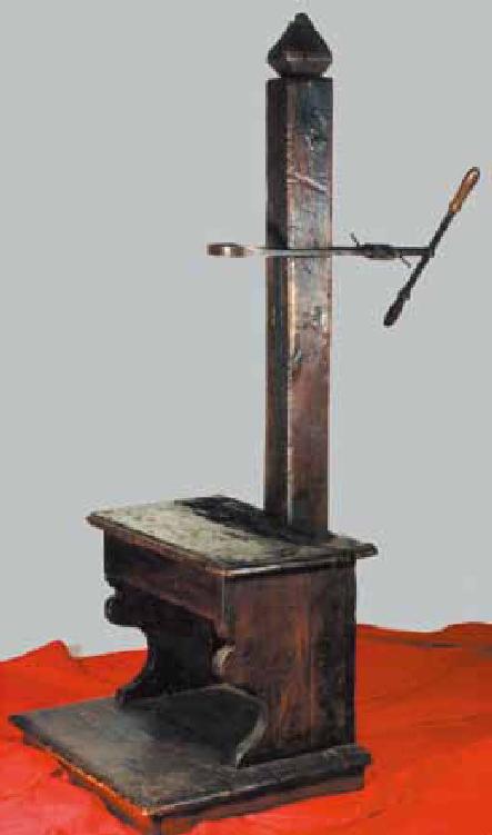 这个装置,有时候被称为“王座”,是一个类似于颈手枷的椅子,目的是固定住受害者的双脚,令其倒立。正如我们在弗朗西斯科·戈雅的这幅图中(页左)看到的,受害者一旦被锁在上面,通常会受到鞭打(请注意该图左边阴影中的行刑人),或者把水灌进他嘴里,令其窒息(图中可以看到一个水罐)。另外,在审讯过程中,会有一个审讯员(中间那个人),还有一个记录受害者所说每句话的书记员。这个刑具受到一些地区的审讯人员的青睐,因为他们的法律只允许对受刑者进行一次酷刑折磨。如果使用这个刑具,他们会宣称,他们只进行了一次折磨——尽管一次可能持续了几周。倘若小心施刑,这种令人痛苦的酷刑不仅是不致命的,而且还不会在受害者身上留下明显的伤痕。