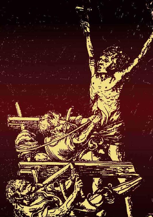 上图中的图片描述的是掏出内脏的情景。受害者被牢牢地固定住,然后在其小腹或胃部割开一个小口,把他的内脏绑在绞盘上。这个恐怖的过程进行得缓慢而小心,目的是在他最终死亡之前,尽可能地延长处决过程。早期基督教的几个殉道者似乎就受到这一酷刑的折磨。