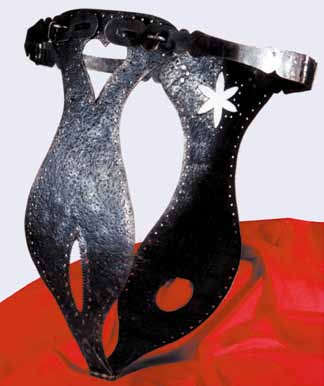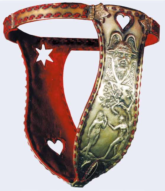 这里有一个相当引人注目的工艺品。贞操带是否被锁在女人们身上,由那些担心她们忠诚的男人们或者为了免遭强奸的妇女们自己决定,这关系到这些装置能否被归入酷刑的类别中。但是,不论你持何种解释,都不能不惊叹它设计之精巧和镀金的工艺水平之高超。