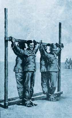 第2种常用的战地刑罚与之相似,罪犯戴上镣铐,只是并不被锁在结实的物体上。这两种刑罚均由军中执法官执行,除非罪犯的连队在行军途中接到命令,这时会由他自己所在的部队对其施刑。