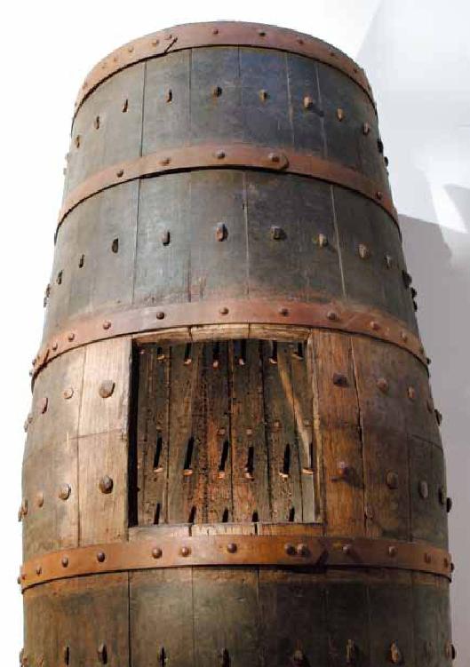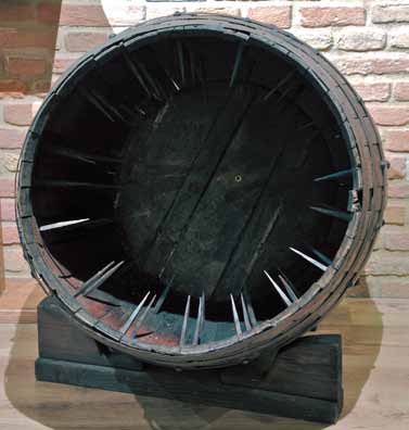 这种钉桶的惩罚相当简单直接。受害者被剥光衣服,然后被强塞进内壁有几百根尖钉的大桶里(就像图中所描绘的)。然后把大桶密封,滚下山,或者在城镇里滚动,甚至被扔进大海,在海浪中颠簸滚动,撞击在海岸上。很明显,经受这种折磨的受害者毫无生还的希望。