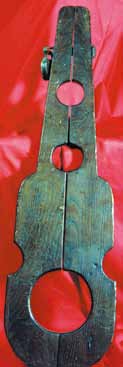 “泼妇提琴枷”或者“颈部提琴枷”,是一种旨在羞辱和折磨人的一种刑具。头会套在较大的孔里,手腕卡在两个较小的孔中。这样受害者很容易被牵着和拖拉。有些这种样式的刑具是用铁链把两个琴脖子连在一块,还有其他的是用一根结实的木条把两个提琴枷的琴脖子接在一块,构成一根长的颈手枷。