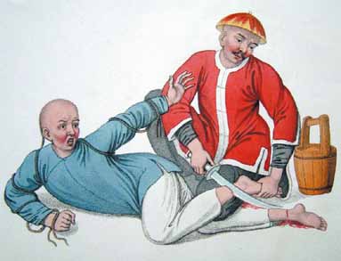 下图是一种在东方国家经常采用的刑罚。从图中可以看到一次使人变跛的行刑场景,受害者的跟腱被割断,这样他就不能行走或站立。这一刑罚可能施加在企图逃跑的奴隶身上(至于一个不能站立的奴隶还有什么用,就不得而知了)。