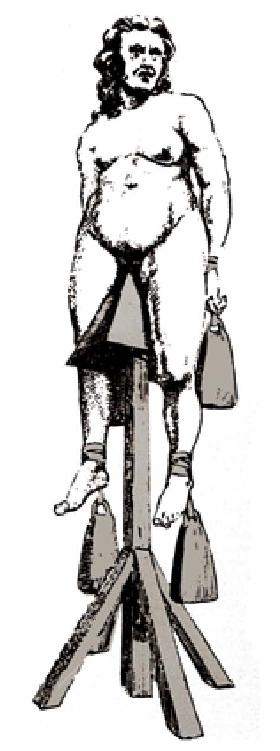 根据审讯员的意思,随后行刑人将让受刑者负重,重量可以在从零到整个身体的体重(甚或添加更多的重物)之间来调节增减。还可以晃动受害者,或者让他反复坠落在尖凳上。当然,他们还可能被无限期地留在这个“歇息”的地方。