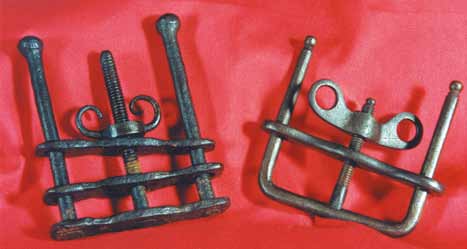 居右是保存完好的两种拇指夹。右上图的那个拇指夹上面有一个铁环,可以连接在束缚器械上,页末的这两个可能是专为施加疼痛而设计的。
