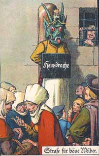 | 这里显示了五花八门、奇特的口钳。从左上角开始按顺时针方向依次是:一个嘴巴封着的驴面面具;一个野猪头形状的面具;一个形似国王或教皇的面具;一个驴或羊头状的口钳。中间的图片是一张德国明信片,描绘的是一个受到公开羞辱的泼妇,被戴上了“河东狮吼”的口钳。 |