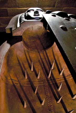 各种各样的钉子是酷刑室的必备利器。这把椅子是一个牢固的木制结构,上面密密麻麻安装了2000多根铁钉,这种简单而恶毒的设计能对受害者施加剧痛。