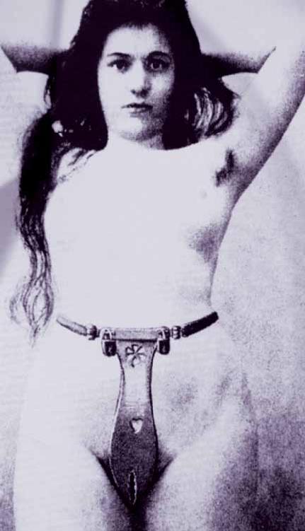 “贞洁带”(Girdle of Purity)、“处女腰带”(Girdle of Venus)、“佛罗伦萨带”(Florentine Girdle):在这个装置的众多名字中,最为大家熟知的是贞操带。腰带所造成的痛苦比预想的要严重得多。这幅图描绘了一种设计形式,它的前面(阴道处)所开的一个孔非常小,为的是可以让人小便,除此之外即使很小的物体都难以进入。但是,上图右边的那个装置,留着一个很大的孔,只是上面布满了非常锋利的铁刺。