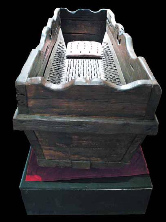 “尖钉摇篮”像一个超大号的摇篮或摇篮车,是一个长方形的大木头盒子,底部安装着摇动装置。“摇篮”的内壁安装着很多锋利的铁钉;当受害者被剥光衣服放进摇篮里的时候,猛烈地摇动它。这个酷刑的后果不言自明,无须进一步的解说。