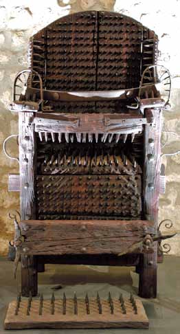 那些尖钉——甚至不带电的一些——施加在赤裸的受害人身上,后果显而易见,无须过多解释。他或她在审讯一开始就要承受巨大的痛苦,在行刑过程中,还会通过晃动他们的身体,或者击打四肢,或者使用负重或挤压的方法来增加他们的痛苦。